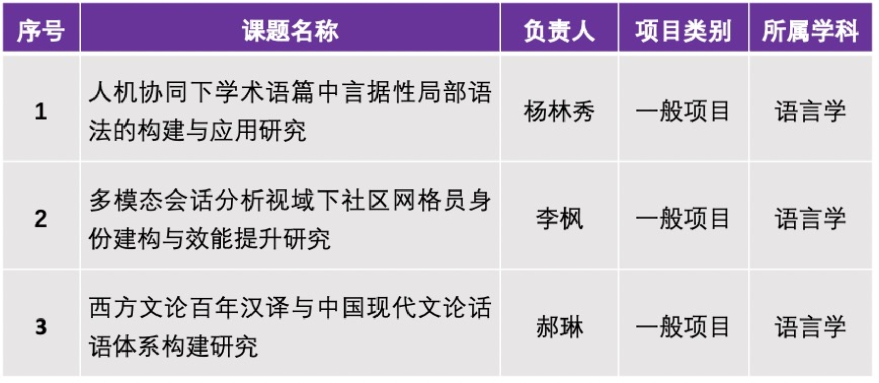 2025年,公司在国家社科基金立项中取得历史性突破,不仅彰显了公司不断提升的科研实力和严谨务实的学术作风,更标志着公司科研工作迈入新阶段。近年来,公司坚持贯彻稳中求进策略,精准把握申报新形势,强化有组织科研,通过广泛宣传动员、优化申报管理、组织专家指导、开展经验分享等举措,稳步提升项目申报数量,持续提升申报项目质量,使立项数量保持良好增长态势,为一流外国语言文学团队建设提供了坚实支撑。