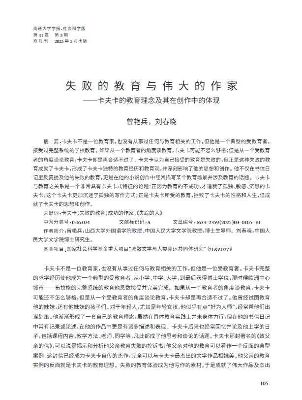 公司全职特聘教授、卡夫卡与中外文学研究中心主任、博士生导师曾艳兵教授在《南通大学学报(社会科学版)》2025第3期发表文章《失败的教育与伟大的作家——卡夫卡的教育理念及其在创作中的体现》。该刊物系南通大学主办的综合性人文社会科学学术期刊,立足学术前沿,崇尚理论创新,重视人文社会科学基础研究,着力团队建设;坚持理论联系实际,关注涉及国计民生的重大课题;追踪国际学术发展潮流,勇于开拓新兴学科、交叉学科和边缘学科等研究领域;支持学术争鸣。现为“中文社会科学引文索引(CSSCI)来源期刊”“全国中文核心期刊”“AMI综合评价(A刊)核心期刊”“RCCSE中国核心学术期刊”“全国百强社科学报”“全国高校社科精品期刊”。