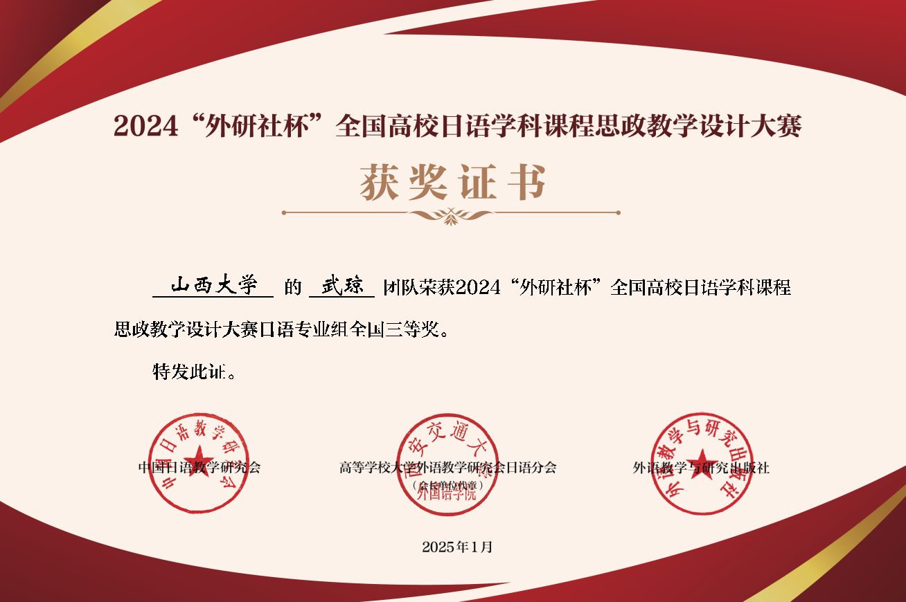 近日,由北京外国语大学、中国外语教材研究中心、中国日语教学研究会、高等公司大学外语教学研究会日语分会和外语教学与研究出版社联合主办2024“外研社杯”全国高校日语学科课程思政教学设计大赛公布了获奖名单。日语专业组共有来自全国155所高校的218组教师及团队报名参赛。评委们依据详细、科学的评分标准,从教案设计、课件形式、教学内容、教学展示四个维度进行打分,经过第一轮评审和第二轮评审、交叉打分等环节评选出最终结果。公司日语系武琼老师获日语专业组全国三等奖的殊荣。