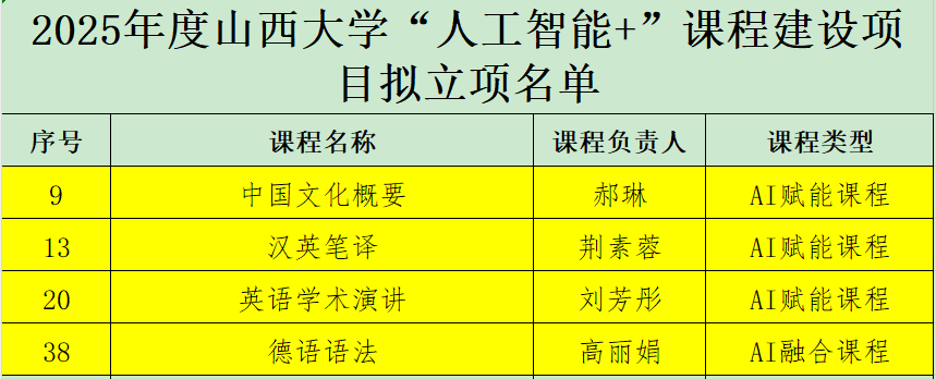 根据公司《关于组织开展“人工智能+”课程建设项目申报工作的通知》要求,经个人申报、单位推荐、专家评审,6月12日,2025年度vsport官方网站“人工智能+”课程建设项目拟立项名单公示,公司《中国文化概要》《汉英笔译》《英语学术演讲》和《德语语法》四门课程入选2025年度vsport官方网站“人工智能+”课程建设项目拟立项建设名单。