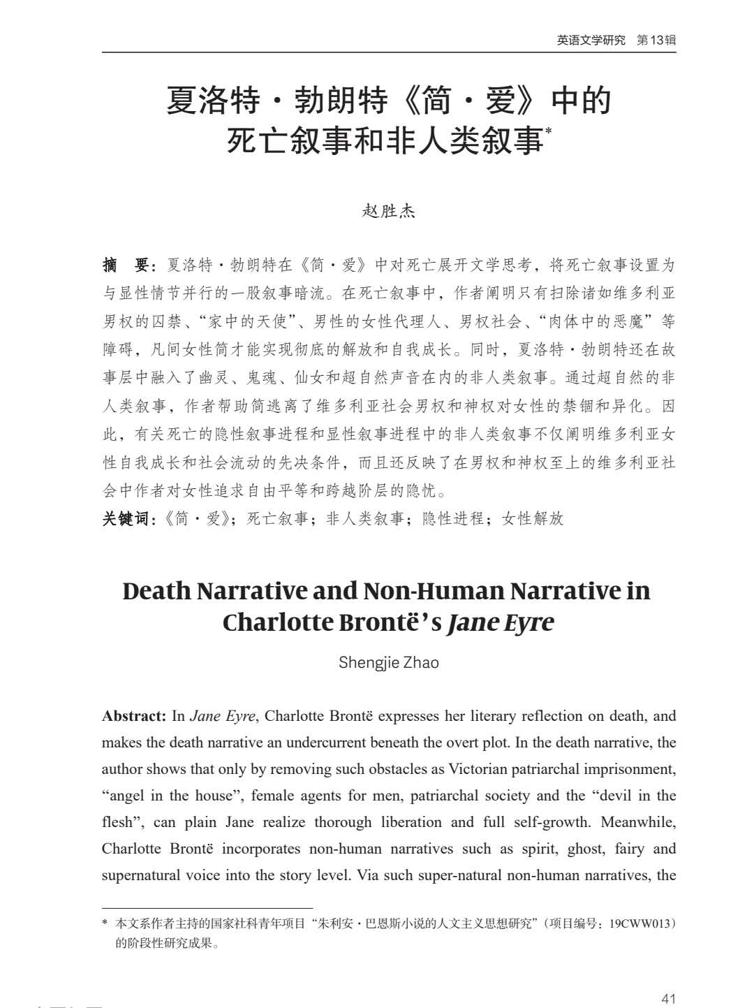 公司赵胜杰副教授在《英语文学研究》2025年第13辑发表题为“夏洛特·勃朗特《简·爱》中的死亡叙事和非人类叙事”的学术论文。《英语文学研究》(Study of Literature in English)由北京外国语大学创办,专门刊载以英语创作的文学为研究对象的文章,侧重于经典文学研究和现当代文学理论与文学批评研究,现为中国人文社会科学核心期刊(AMI)。