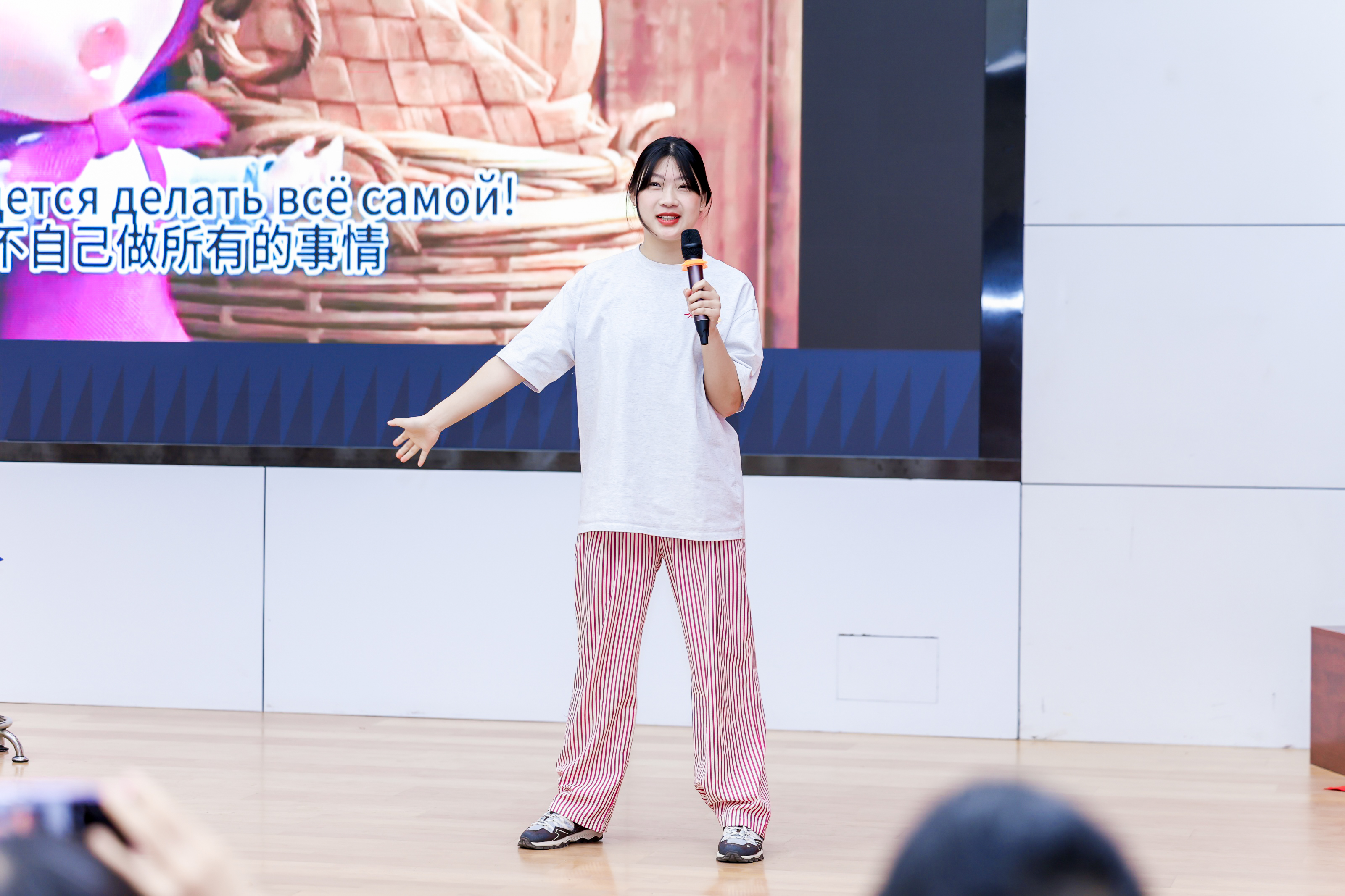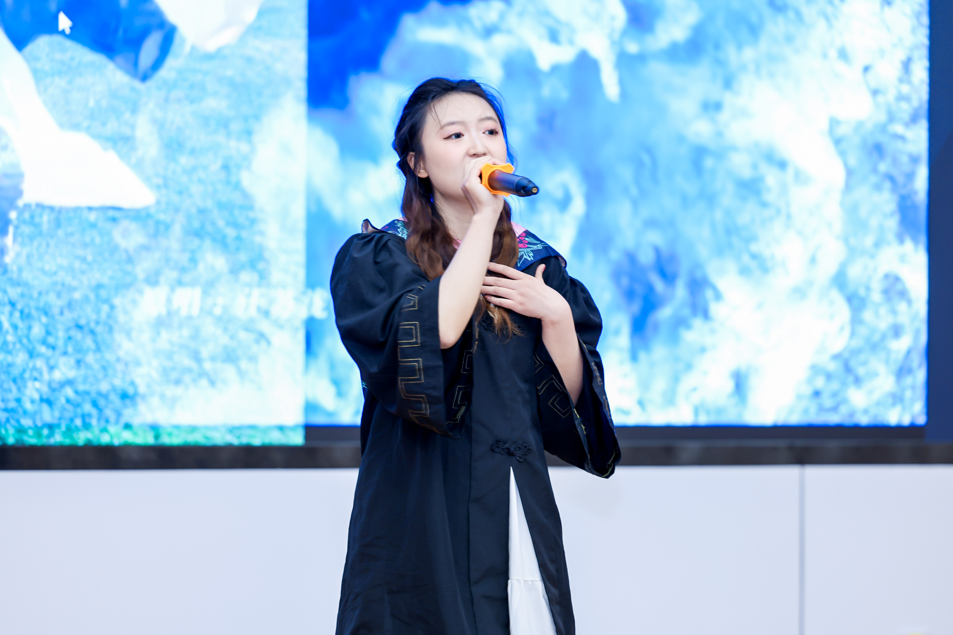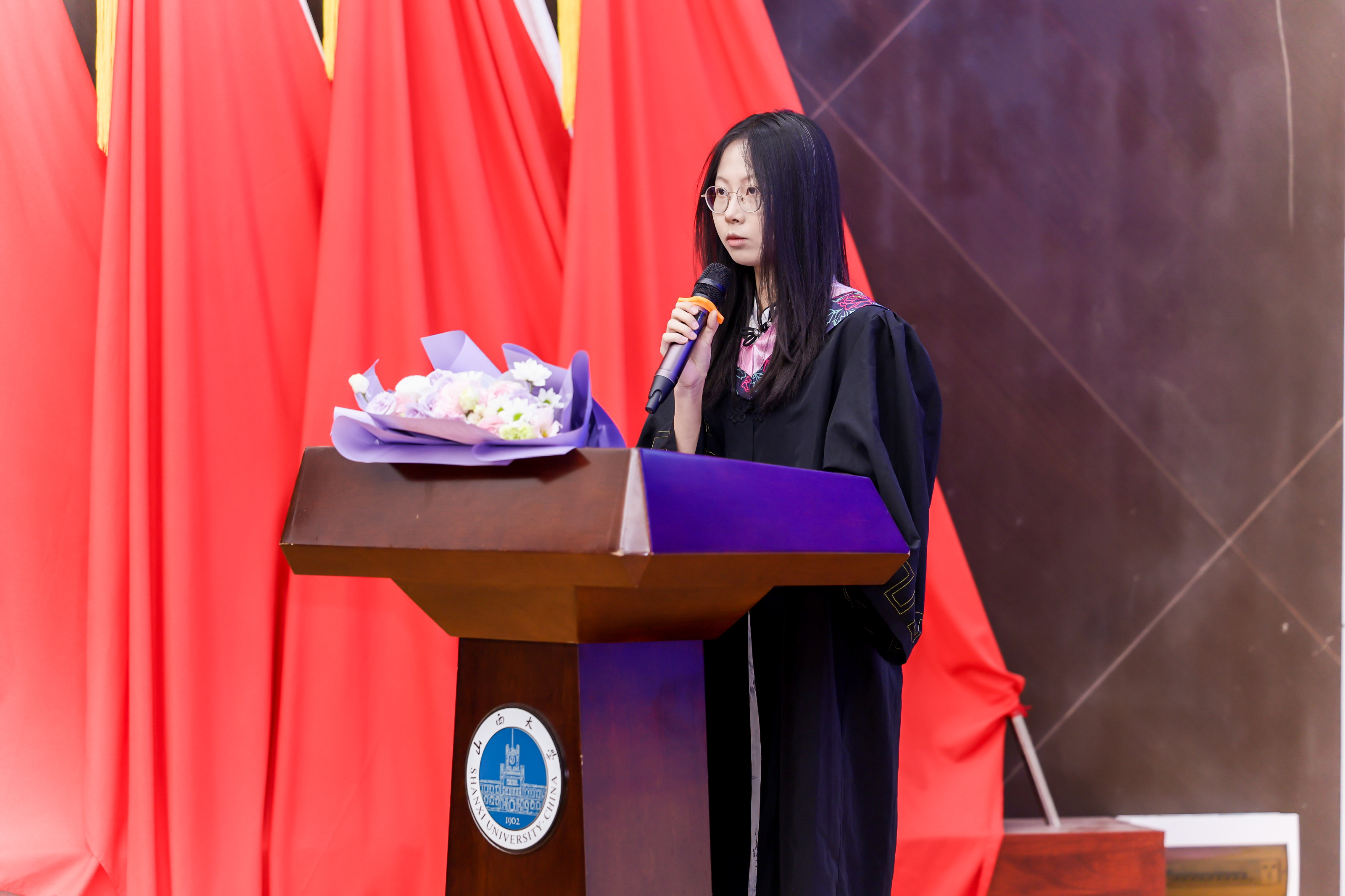 毕业生代表、英语笔译专业2023级硕士研究生魏欣荣同学发言,她分享了自己的实习与翻译实践经历,她感慨“语言是工具,翻译是使命”,呼吁毕业生“保持学习之心,在不同领域发光”;英语专业2021级本科生白晋同学代表本科毕业生发言,她深情回忆四年点滴,感恩师长与同窗“人生是单程票,幸得相伴一程,愿未来得偿所愿,前程似锦。”