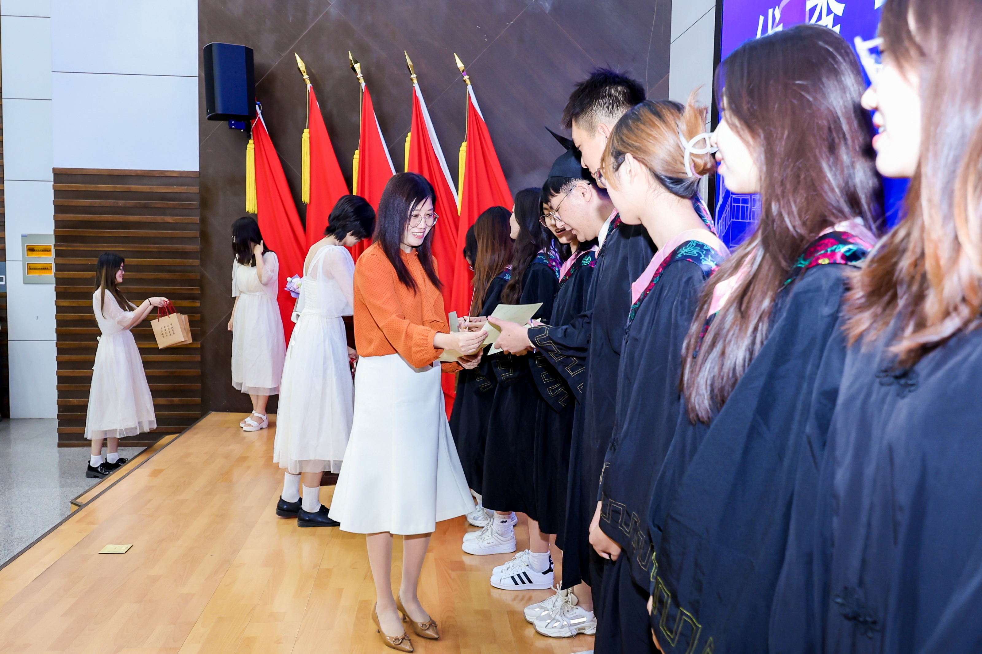 在激动人心的学位授予环节,伴随着庄严而欢快的乐曲,毕业生们依次有序走上主席台,经理杨林秀为每一位走到台前的毕业生拨正流苏、颁发学位证书并合影留念。台下闪光灯频频亮起,记录下这荣耀与喜悦交织的瞬间。