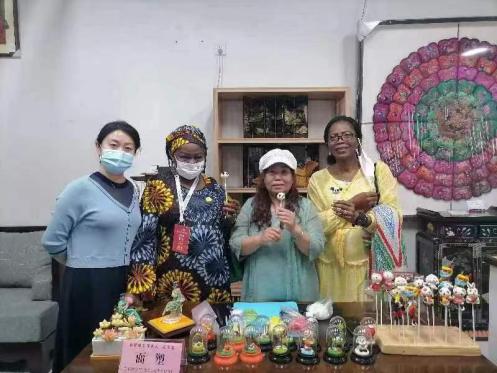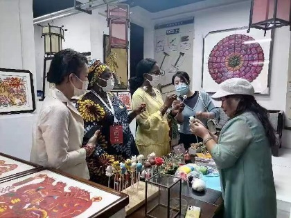 在接待期间,张玥老师陪同四位大使夫人前往小井峪文化产业园,游览了三晋窑火厅、金工晋铸厅和漆彩三晋厅,大家共同学习了面艺、刺绣和漆器等山西非物质文化遗产项目。最后,大家在文房四宝厅歇脚,品晋茶,听晋乐,观晋腔。在陪同翻译期间,张玥老师特别对山西文化专有名词进行了解释,解决了语言沟通方面的问题,打破了交流隔阂,促进了大使夫人们对山西非物质文化有了更加具体深入的了解。