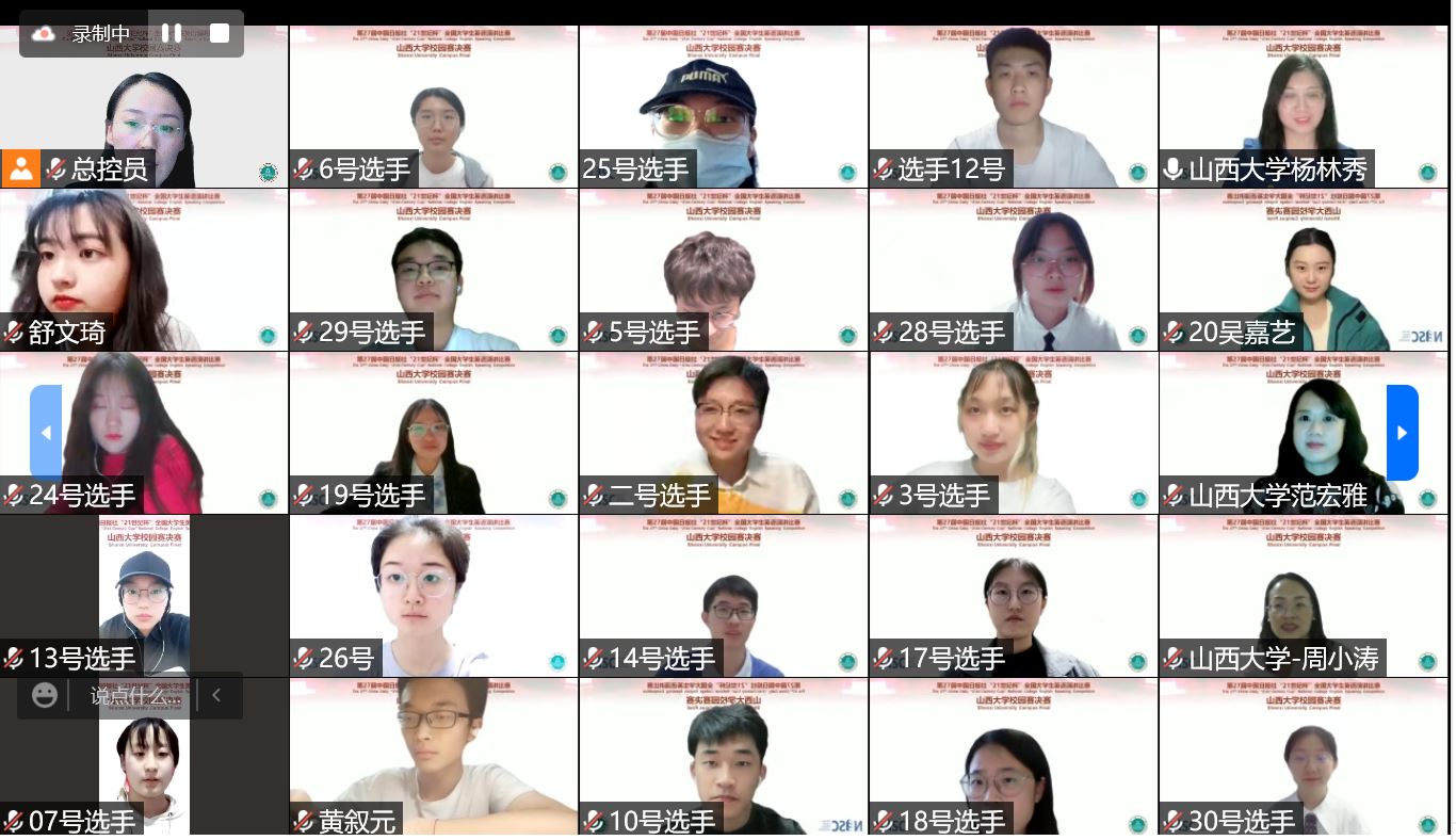 4月24日下午2:30,由vsport官方网站承办的第27届中国日报社“21世纪杯”全国老员工英语演讲比赛vsport官方网站校园选拔赛于腾讯会议线上成功举办并同步直播。来自三个校区、各个专业的30位精英选手从参与网络预选赛的164位选手中脱颖而出,克服封闭隔离期间的重重困难,呈现出一场有思想、有智慧、有深度、有温度的线上语言竞技盛宴。