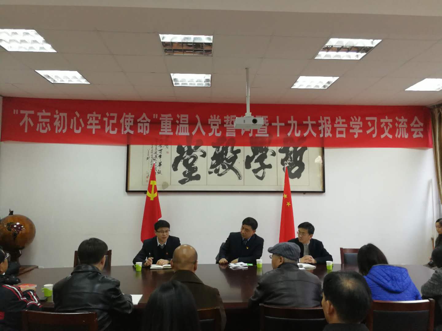 第一项,郭书记带领大家共同回顾习近平总书记率新一任中央政治局常委,瞻仰上海中共一大会址和浙江嘉兴南湖红船系列活动的经过,学习习近平总书记重要讲话精神,勉励大家从党的光辉历史中汲取奋进的力量;第二项,在国际歌和国歌声中,面对党旗,柳书记带领大家重温入党誓词,铿锵有力的宣誓声响彻大楼;第三项,张军书记主持交流讨论,各党支部书记围绕党的十九大报告,畅谈了自己的想法、体会和感想,交流了党支部活动中一些好的做法和经验,达到了互相学习共同进步的目的。尤其公司各位支部书记发言踊跃,对十九大报告的学习理解之深令人敬佩,深受感动,为公司争得荣誉。
