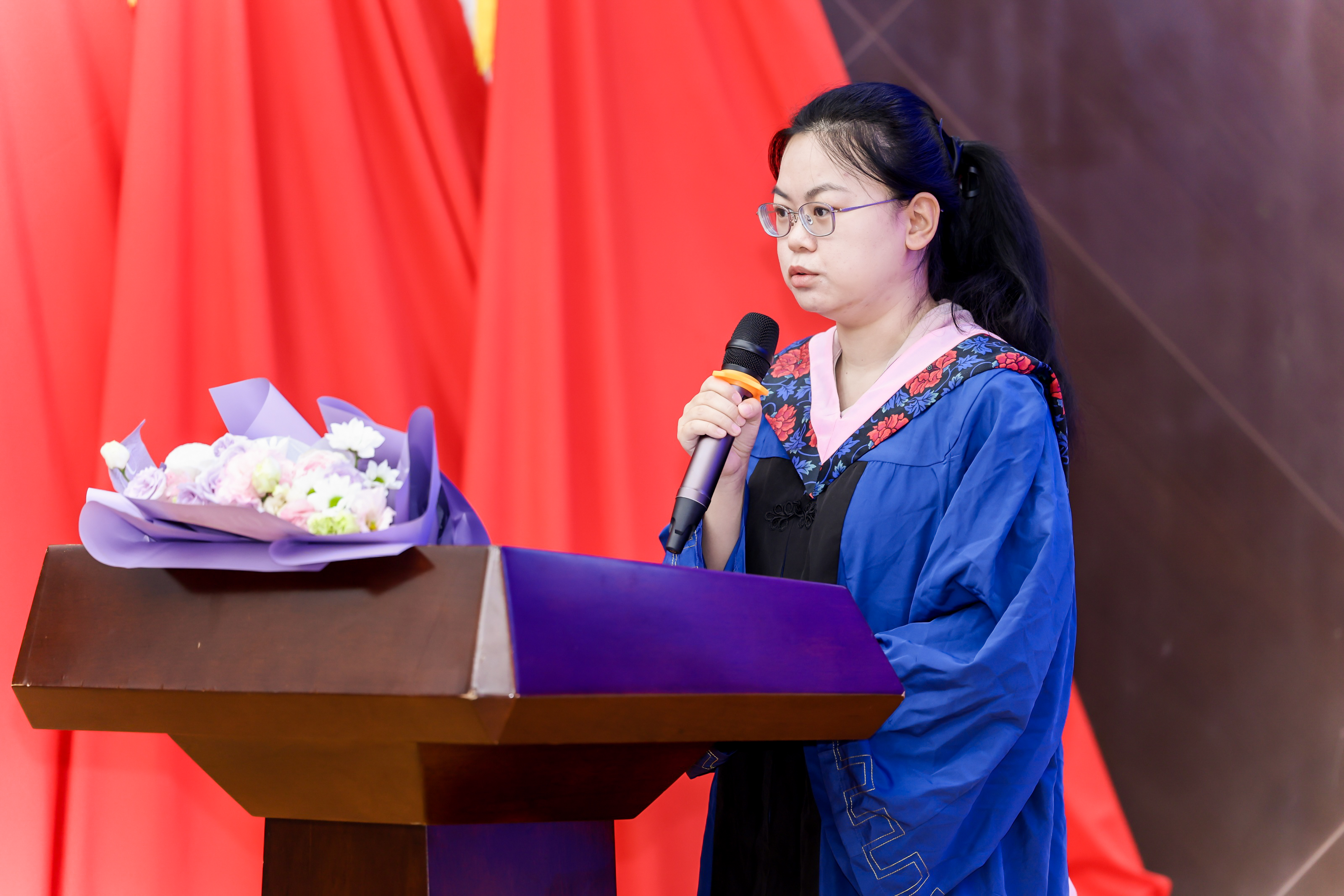 毕业生代表、英语笔译专业2023级硕士研究生魏欣荣同学发言,她分享了自己的实习与翻译实践经历,她感慨“语言是工具,翻译是使命”,呼吁毕业生“保持学习之心,在不同领域发光”;英语专业2021级本科生白晋同学代表本科毕业生发言,她深情回忆四年点滴,感恩师长与同窗“人生是单程票,幸得相伴一程,愿未来得偿所愿,前程似锦。”