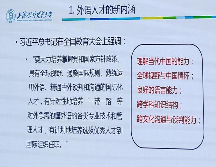 关于“外语人才的新内涵”,温教授引用习近平总书记在全国教育大会上发表的重要讲话,指出外语人才是具备理解当代中国的能力、全球视野与中国情怀、良好的语言能力、跨学科知识结构、跨文化沟通与谈判能力、优秀的应变与管理能力的新型人才。