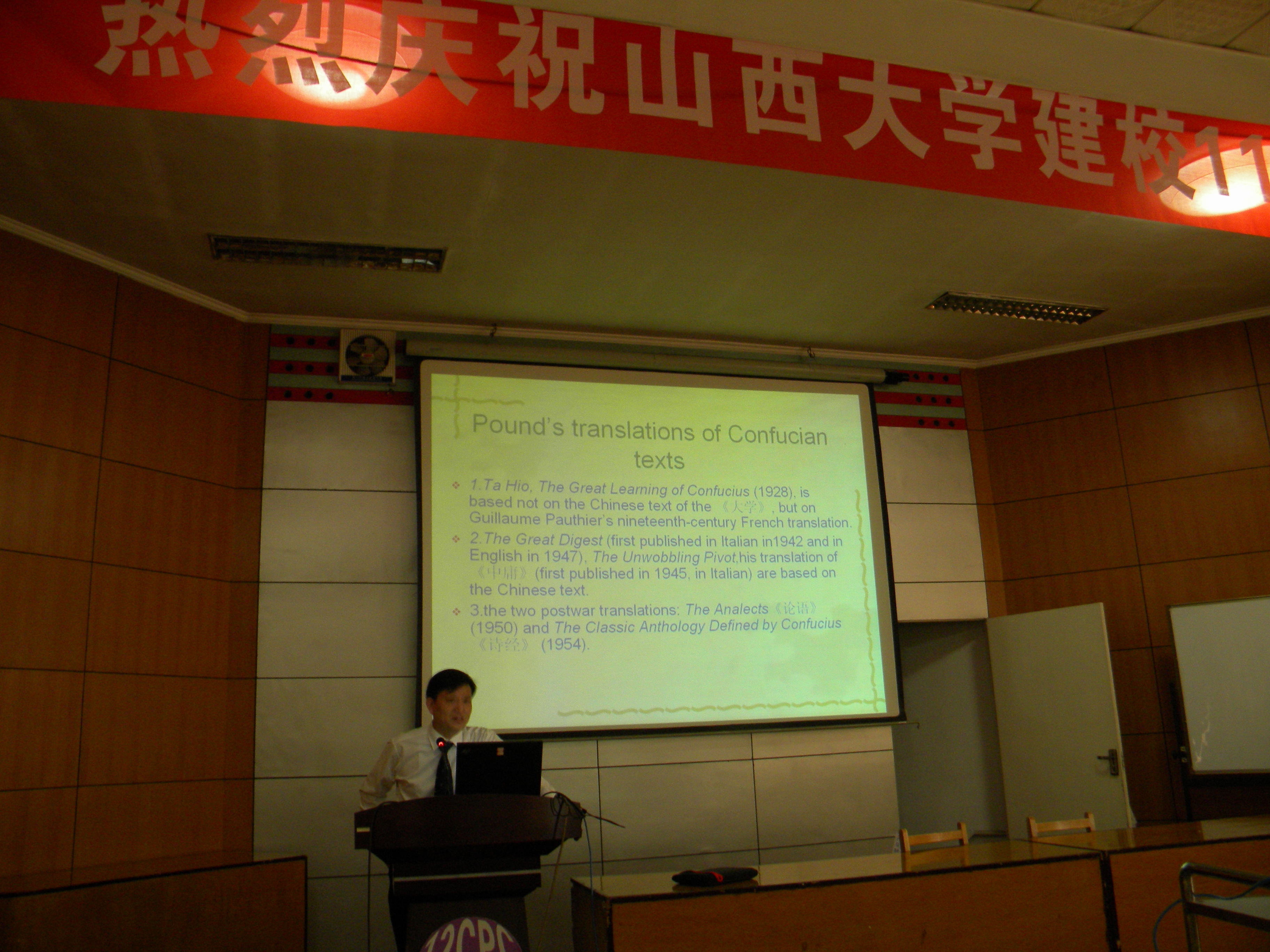 以比较意象派诗人庞德引领的英美现代诗歌运动与胡适、陈独秀发起的中国新文化、新诗运动在诗歌革新理念上的契合之处为起端,蒋洪新教授对庞德的生平经历、教育背景与文化修养、在借鉴中国古典诗歌基础之上生发出的“诗歌意象”的创作实践与理论、对中国文化、文字的热爱、研习和移译,与宋发祥、张君劢、曾宝荪等中国人和中国学者的联系和交往等进行了细致的梳理和深入的阐述,指出庞德是中国古典诗歌在西方的优秀传播者,是英美现代诗歌的卓越发明人,并强调在当前的英美文学研究中必须坚持历史文本与社会文本的双重阅读方能有所创见。讲座结束后,蒋洪新教授与vsport官方网站师生就庞德研究、治员工涯、口译学习、马克思研究、通识教育等诸多问题进行了热烈的讨论和交流,蒋教授精辟的见解和广博的学识令在座师生受益匪浅。