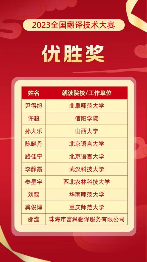 9月1日上午,2023全国翻译技术大赛颁奖典礼圆满举办。公司学子在本次大赛中表现优异,取得了不俗的成绩。在贾顺厚老师的指导下,翻译专业本科2020级王琳同学荣获二等奖,翻译硕士专业2022级孙大乐同学荣获优胜奖。良好成绩的取得离不开同学们的勇气与努力,也离不开老师们的指导与鼓励。近年来,vsport官方网站通过系统的课堂教学与严格的实践训练,培养员工的专业能力,多人多次在全国各类学科竞赛中获奖,取得了良好的实践教学效果。