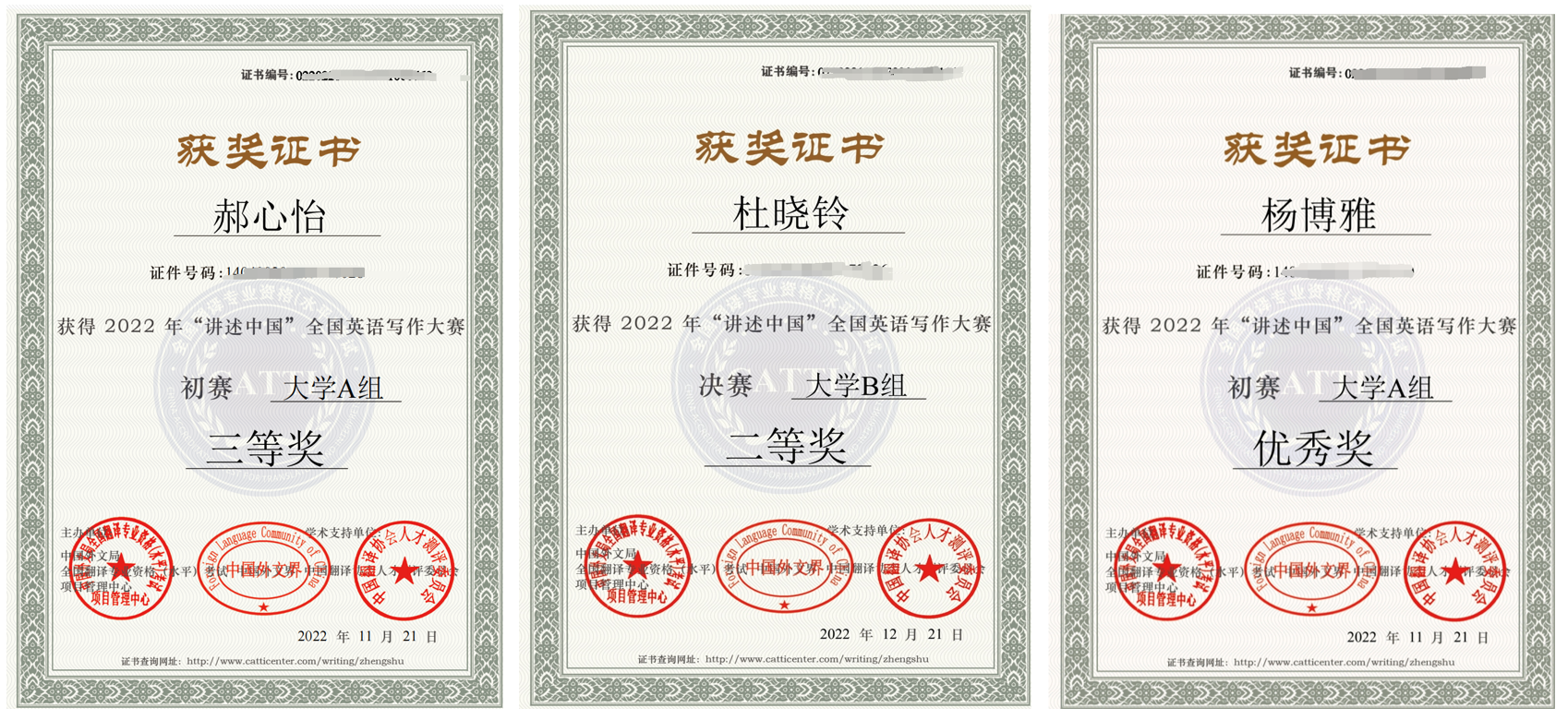 近日,由中国外文局CATTI项目管理中心与中国外文界联合主办的2022年“讲述中国”全国英语写作大赛初赛和决赛圆满结束。本次赛事旨在通过比赛鼓励员工用外语讲述中国故事,全面提升当代老员工等各类群体的英语写作能力和素养,培养和发现优秀的英语写作人才,向世界推介更多具有中国特色、体现中国精神、蕴藏中国智慧的优秀中国文化。经过专家严格评选,公司13名参赛选手榜上有名。其中,初赛三等奖11名、优秀奖2名,法公司2021级法学专业杜晓玲同学更是以优异表现获得大学英语B组决赛二等奖的好成绩。