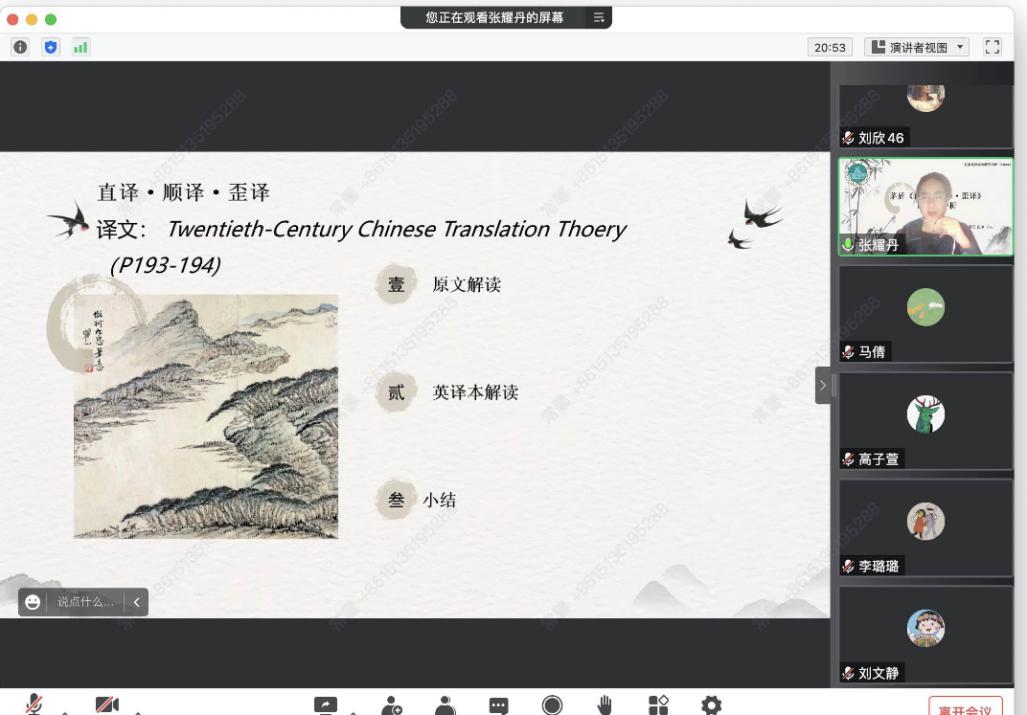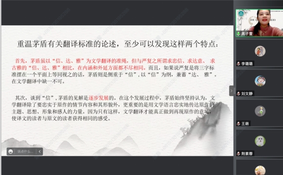 讲座的第二部分由张耀丹同学主讲。她为大家介绍了茅盾“直译”思想的发展脉络,《直译·顺译·歪译》的原文解读及其英文译本的翻译解读,回顾了文章主要内容。茅盾指出“直译”不等同于“顺译”或“歪译”,因为“歪译”会歪曲原作的思想和风格,但“直译”是为了让人“看得懂”,其“原则并不在‘字对字’一个也不多,一个也不少。‘直译’的意义就是‘不要歪曲了原作的面目’”。之后,在对英文译本的解读中,张耀丹同学列举了多个翻译案例加以分析,谈到了在翻译古代姓氏、中国文化特色词语、文言文等内容时可以采取的翻译方法及注意事项。最后,对茅盾的直译观点以及《直译·顺译·歪译》英译本分析进行了总结。