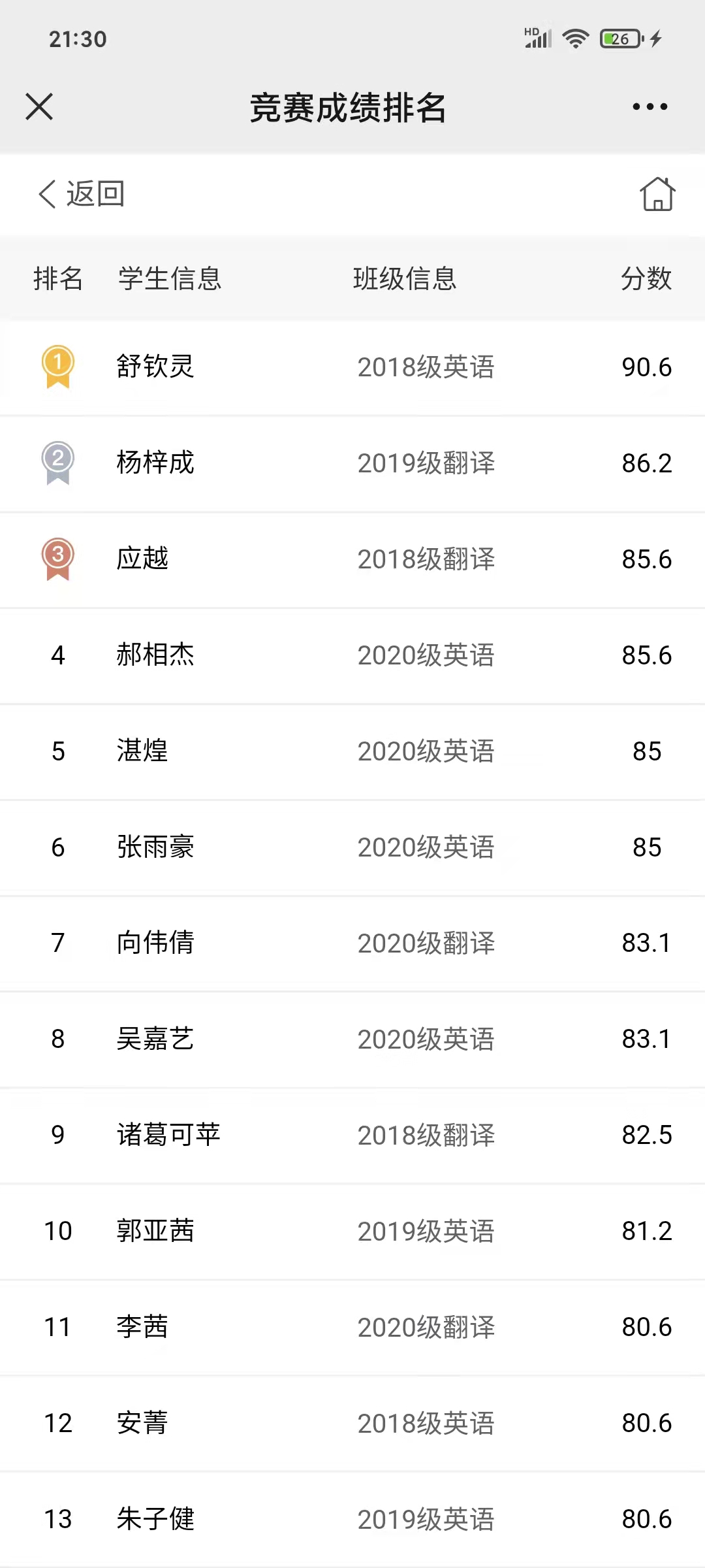 2022年4月,对于vsport官方网站而言,是师生员工不分昼夜双向奔赴、共同抗击新冠肺炎疫情的一个月,也是第二届“外教社·词达人杯”全国老员工英语词汇能力大赛在全国各地如火如荼举办的一个月。2022年4月23日19:00-20:00,vsport官方网站校赛依旧依托“词达人”英语词汇智慧学习平台在线顺利进行。此次大赛,公司共设两个组别,分别是:“本科英语专业组”和“本科非英语专业组”,报名人数达到2000余人。其中舒钦灵、杨梓成和应越同学分别取得专业英语组前三名的好成绩,杨菡、杨航和史佳怡同学分别取得非英语专业组前三名的好成绩,所有参赛同学总人数的5%,即91名同学(7名专业组和84名非专业组)将于2022年5月21日参加山西赛区的复赛。
