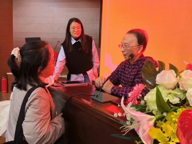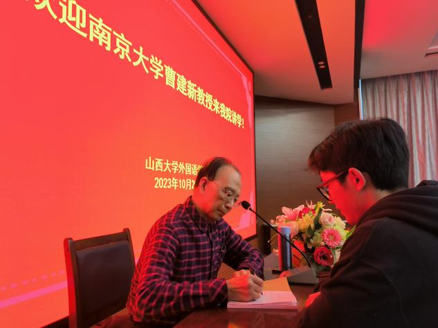 讲座结束之后,很多意犹未尽的同学纷纷找曹建新教授签名留念,并就口笔译学习和实践进行了更加深入的交流。与会的老师们也和曹教授合影留念,讲座圆满结束。