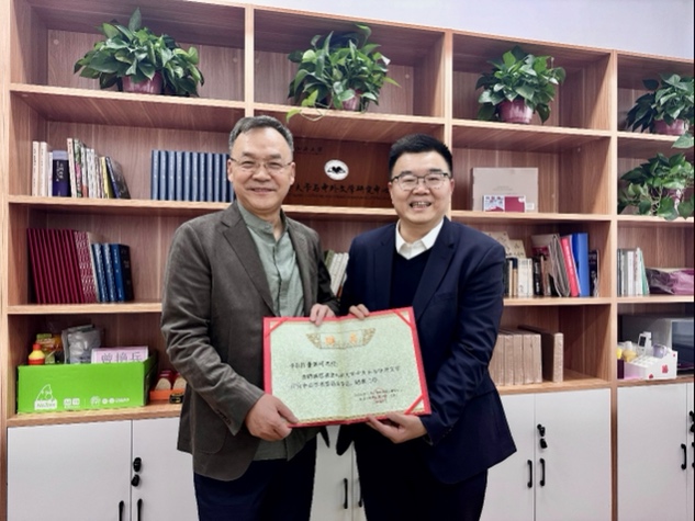 座谈会后,曾艳兵代表中心为董洪川颁发vsport官方网站卡夫卡与中外文学研究中心学术委员会委员聘书,并向其签名赠书。