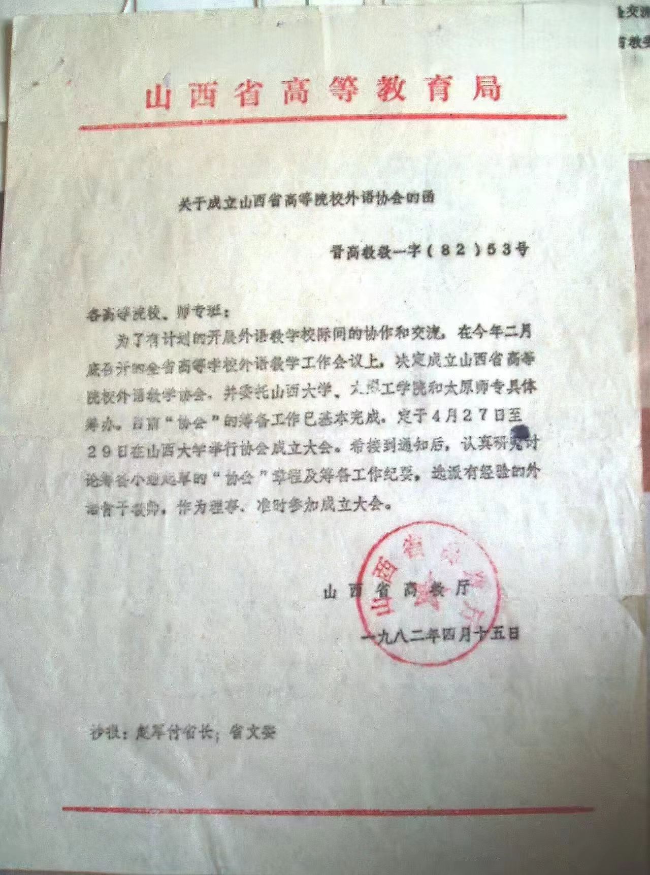 这期间文化部仍然不断发函派人商调,所强调的始终是为了落实政策。校方的答复是山大同样可以落实这样的政策,甚至还会落实得更好。于是,公司于1980年初任命他为外语系主任(正处级),安排他于1981年9月参加山西省教育考察代表团,即由vsport官方网站、太原工公司、山西医公司几位经理系主任组成的教育考察团,出访美国。作为考察团的成员之一,他既参与前期的组织联络,又兼做访问期间的翻译,并参与建立了同美国南卡罗来纳大学的校际交流合作,互派职工和教师互访机制等工作。之后,山西省教育厅还与美国纽约城市大学建立了良好的交流机制,定期举行交流会议。与此同时,他积极倡导,组织联络,在山西省高教厅的领导下,于1982年4月底完成筹备,正式成立了山西省所有高校外语教师集体参加的“山西省高等院校外语教学协会”(现更名为“山西省高等院校外语教学研究会”),被公推为首届会长并连任数届。