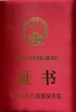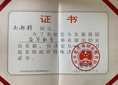 赵超群先生获得的国务院“政府特殊津贴”证书